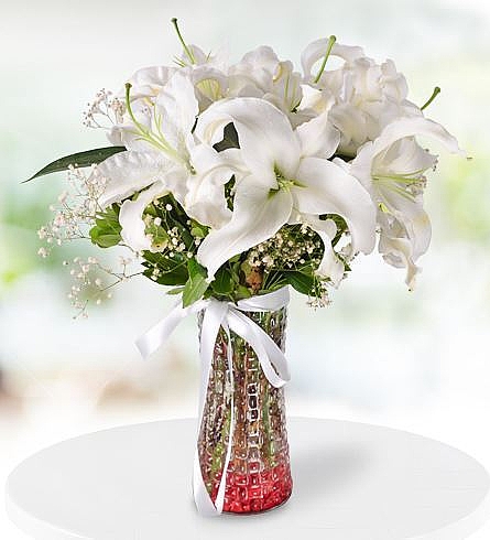 cam vazoda beyaz lilyum izmir çiçek siparişi için mükemmel kokulu çiçek