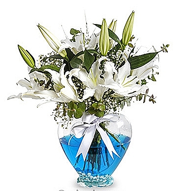 kalp cam vazoda 2 dal beyaz lilyum okyanus mavisi suyun içinde yazın güzelliğini sunuyor
