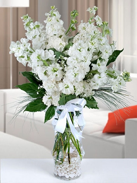 beyaz kokulu şebboylar cam vazo içinde süslenmiş olarak izmir içine hızlı servis