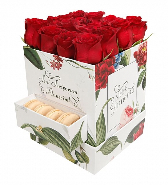 annemize özel kutuda güller ve makaron